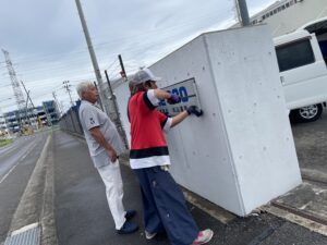 北上事業所では、4月の開設以来、当社であることを示すサインは何一つありませんでしたが、このたび壁面に社名ロゴを取り付け、ゲートのフェンスに本社で使っていたサイン看板をフェンスに設置しました。