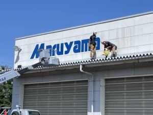 本社のゲートに設置しているサイン看板を、100億円企業をめざす当社に相応しい上質なもの(SUS HL板+ SUS切り文字仕様)にリニューアルしました。そして、これまで8年近く頑張ってくれていたサイン看板は北上事業所で再利用。